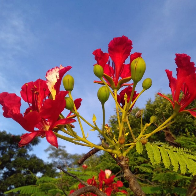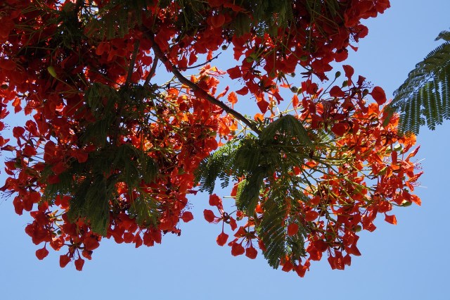 Lorsqu’on voit le flamboyant de loin ou de près, il serait bien difficile rester de marbre face à sa splendeur et à sa beauté inégalée. Ses fleurs rouges, parfois jaunes et ses grandes gousses brunes ne peuvent qu’émerveiller les prunelles.