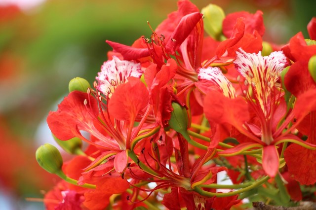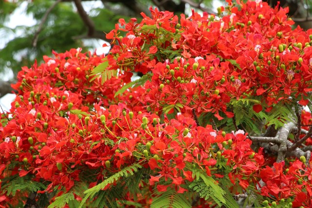 La floraison de cet arbre à caduc est d’une naturelle magnificence. Juste au début de l’été, ses branches se remplissent de grappes de grosses fleurs d’un rouge éclatant et aux longues étamines. Voilà un plaisir qu’on ne se laissera point d’admirer. Notez que seuls les flamboyants datant de plus d’une dizaine d’années seulement fleurissent.