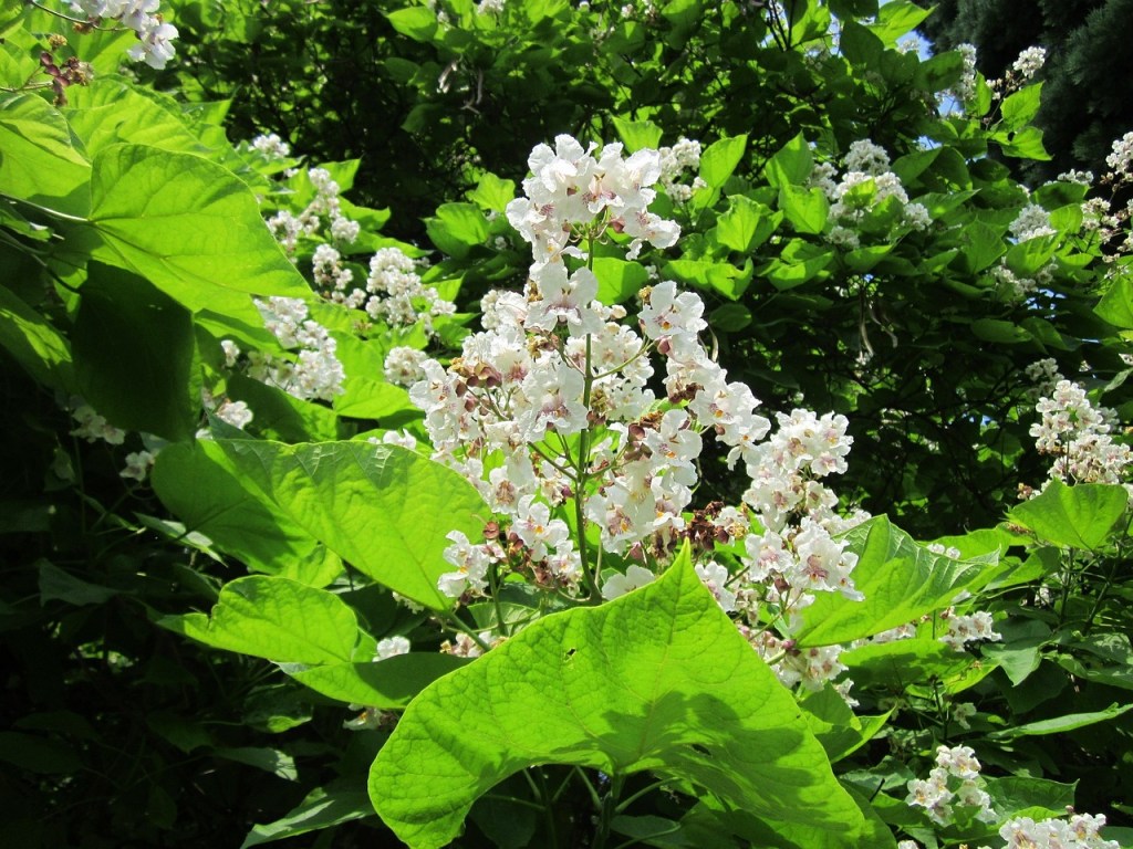 Le catalpa est également connu pour ses fleurs en grappes blanches ou roses apparaissant en été.